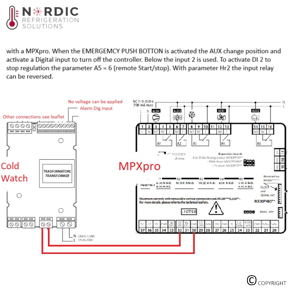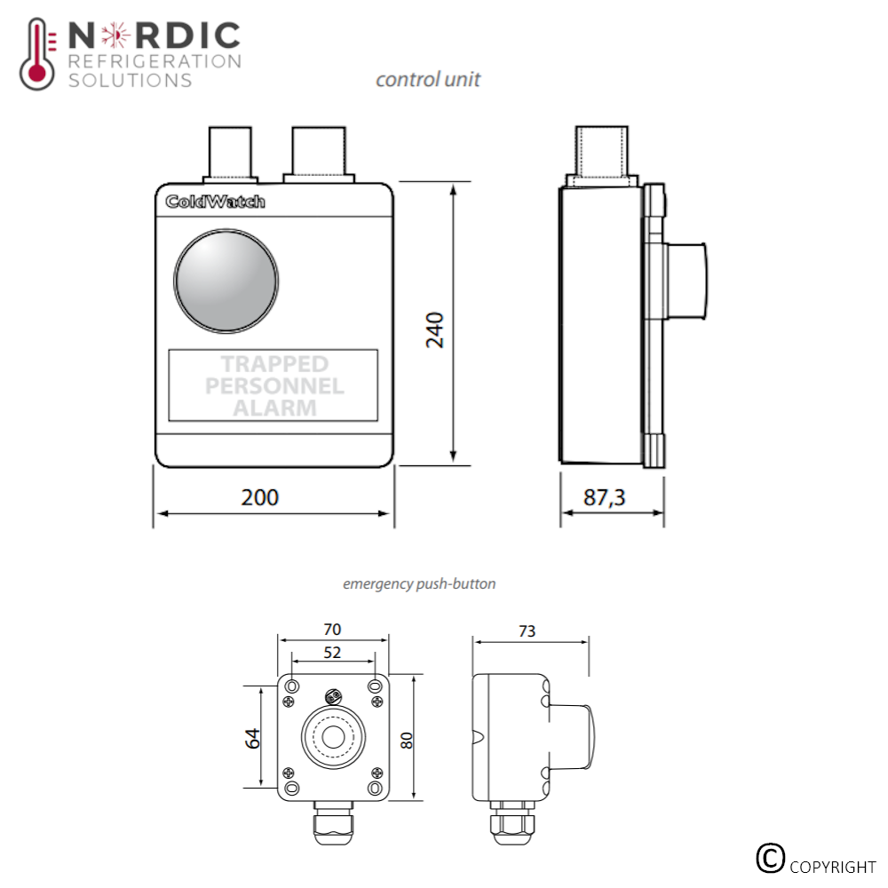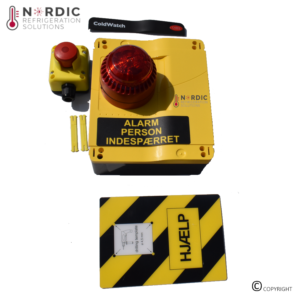 Emergency kit for signalling when people are trapped inside a cold room, with customisable alarm relay logic.